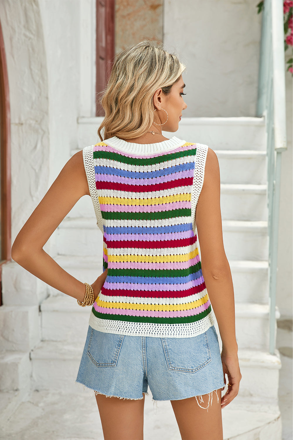 Add a splash of fun to your outfit with this colorful tank top. • Its detailed cutout pattern brings a stylish edge to the sleeveless design, making it a standout piece. • Made from soft, high-quality knit fabric, it delivers comfort without sacrificing flair. • Featuring lively multicolored stripes, this top is perfect for mixing and matching to create your own unique look.