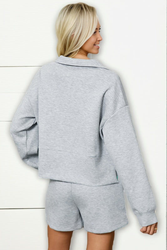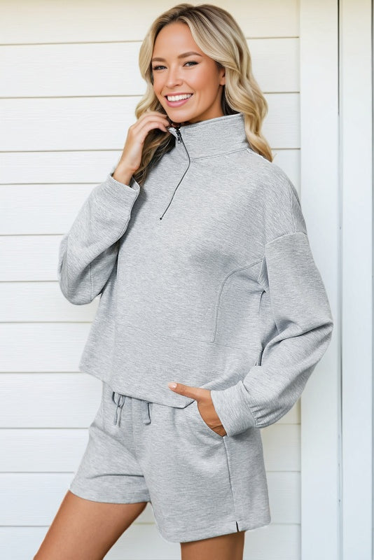 This light grey shorts set brings casual cool with its clean, simple look and comfy fit. The quarter-zip detail gives it a fresh, modern vibe, perfect for layering up or rocking solo. Made from soft, breathable fabric, it keeps you comfy and free to move, whether you're lounging or out and about.