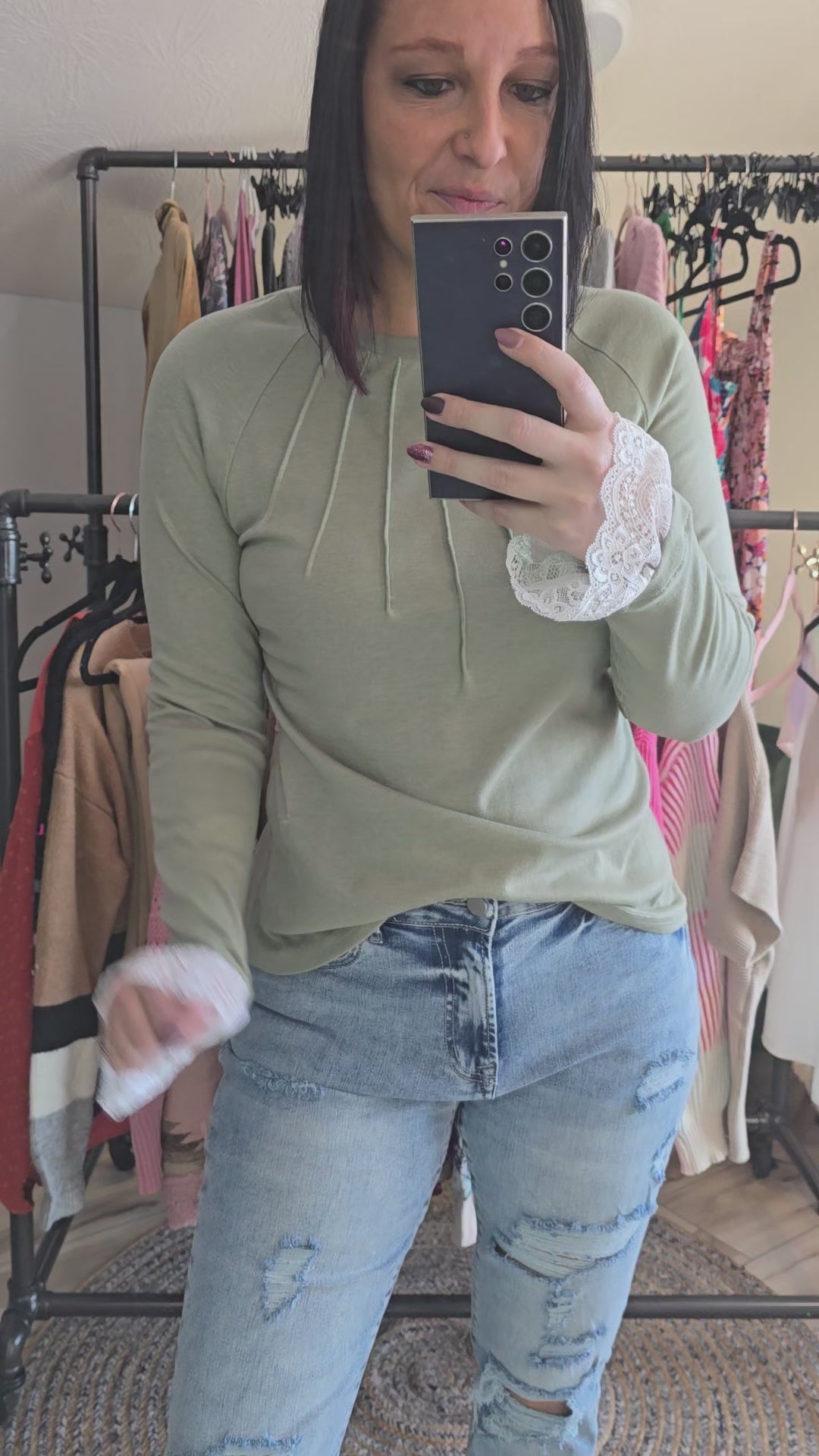 Introducing the Ray of Sunshine Lace Cuff Top - the ultimate blend of style and comfort. Featuring intricate seam detailing and raglan sleeves for a modern, relaxed fit. Delicate lace contrast cuffs add a touch of femininity. Perfect for showcasing your favorite accessories and jewelry. Elevate your wardrobe today!