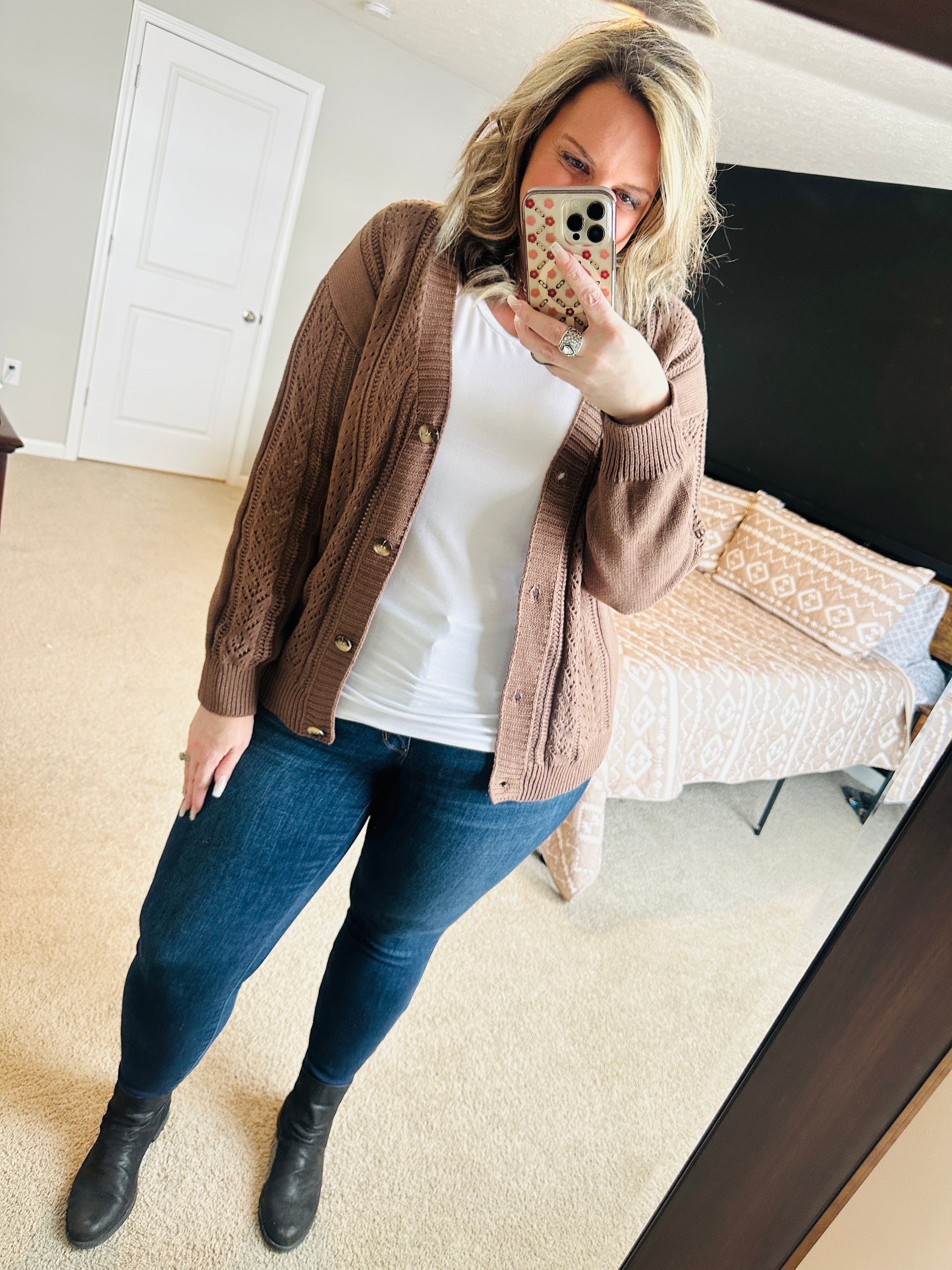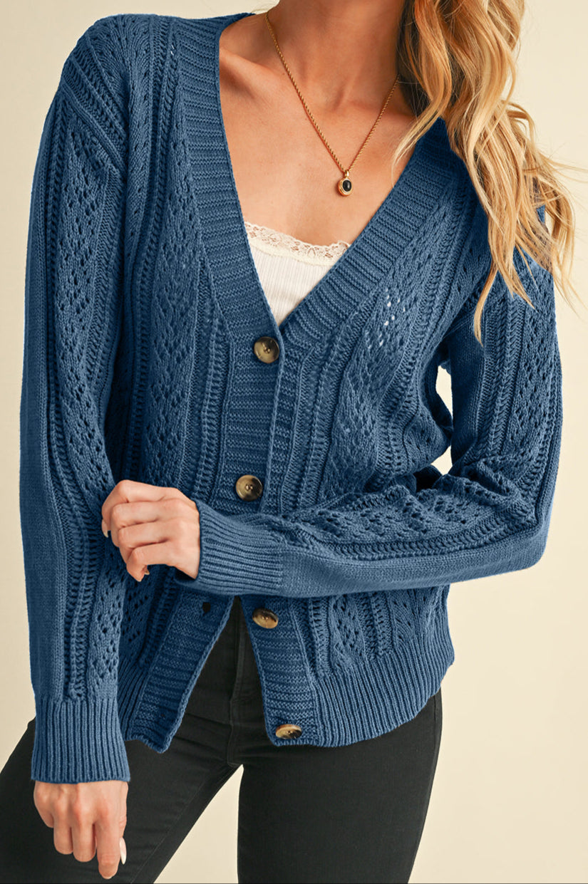 Stay stylish and comfortable with this relaxed-fit knit cardigan. Featuring a soft, textured design, this layering essential comes with a flattering V-neckline and charming button closures. Perfect for chilly days, it pairs effortlessly with your favorite jeans or leggings for a chic, laid-back look. The lightweight yet warm knit fabric makes it ideal for transitioning through the seasons. Whether you’re running errands or enjoying a cozy evening in, this cardigan has you covered in style.